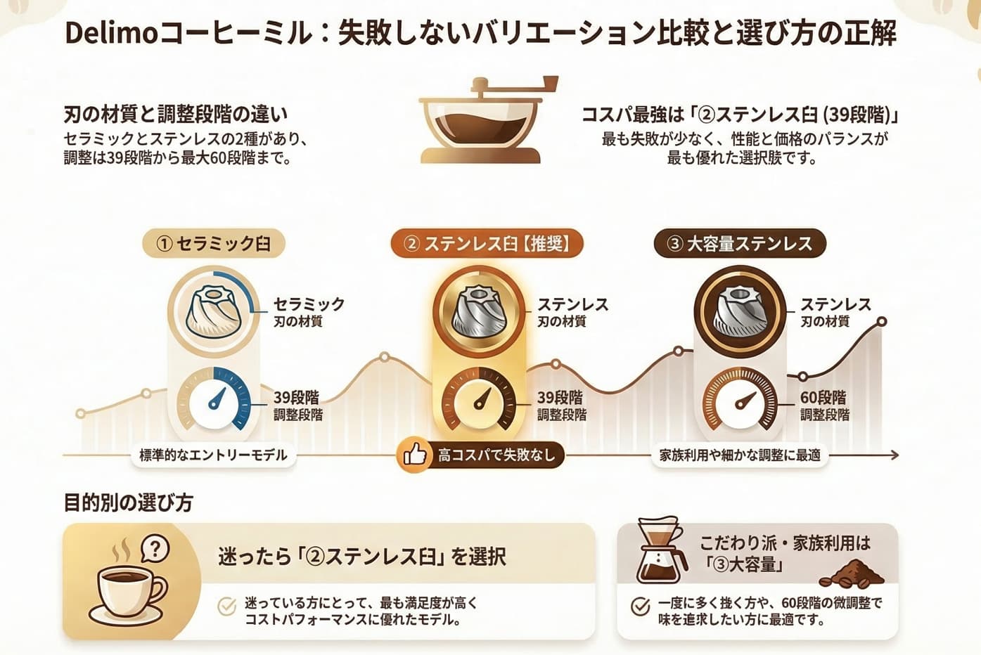 迷ったら、真ん中の「ステンレス臼モデル(39段階)」を選んでください。これが最も失敗がなく、価格と性能のバランスが取れたベストバイです。もしご家族が多く、毎朝何度も豆を挽くのが面倒だと感じているなら、「大容量モデル(60段階)」が日々のストレスを劇的に軽減してくれますよ。
